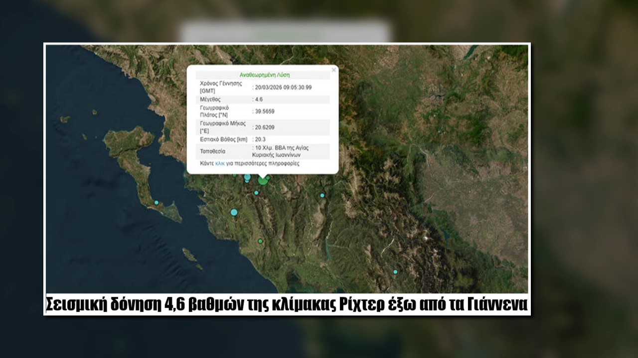 Σεισμική δόνηση μεγέθους 4,6 βαθμών της κλίμακας Ρίχτερ, σημειώθηκε λίγο μετά τις 11:00 το πρωί της Παρασκευής 20 Μαρτίου 2026, έξω από τα Γιάννενα.